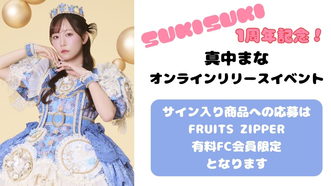 7/15(水)FRUITS ZIPPER 5thシングルCD対象 ■商品情報 【FC会員で、SUKISUKIマイページでPlus member IDを登録した方のみ応募可能】 ①A4生写真(宛名、サイン、一言コメント) + 初回限定盤1枚 + FRUITS ZIPPER盤2枚 + 通常盤2枚 ¥9000(税込) ②2L判生写真(宛名、サイン、印字コメント) + 初回限定盤1枚 + FRUITS ZIPPER盤1枚 + 通常盤1枚 ¥6000(税込) ③L判生写真(宛名、サイン) + 通常盤3枚 ¥3600(税込) 【どなたでもご応募可能】 ④デジタルビンゴ券付きプリントチェキ(5種ランダム) + 通常盤3枚 ¥3600(税込) ⑤デジタルビンゴ券付き自撮りトレカ(5種ランダム) + 通常盤1枚 ¥1200(税込) ★応募対象者★ ①②③:SUKISUKIのマイページにPlus member IDを登録した方のみ応募可能 ④⑤:ビンゴ対象商品は全てのお客様応募可能 ------------------------------------------- 今回のBINGO賞はSUKISUKI1周年を記念して !!真中まながプロデュース!! ------------------------------------------- ◾️真中まなプロデュース BINGO賞 1番目〜100番目 オンライン1on1トーク(20秒)※6/2の19:00-以降開催 101番目〜200番目 当日撮り下ろしチェキ(サインなし) ※ビンゴ当選者は、合計200名となります。 ※ビンゴ当選者の発表はございません。当選内容は後日メールでお知らせいたします。 ※デジタルビンゴ券付き商品を購入された方全ての方を対象にビンゴを実施します。 オンライン1on1トークについて ・オンライン1on1トークは6月2日19:00に開催します。(振替不可) ・当選者への案内は5月中旬頃にメールいたします。 ■BINGOしなかった方の中から抽選で下記『ハズレ賞』をプレゼント! ・1名 真中まながちょっと遠くからあなたを応援してくれる動画 ・5名 真中まな直筆一言入りチェキスリーブ ・5名 真中まなのお名前入り応援メッセージボイス 1:「(ニックネーム)+もっとできるよ!」 2:「(ニックネーム)+あと1セット」 3:「(ニックネーム)+限界超えてこー!」 4:「(ニックネーム)+の努力が美しいよ!」 5:「(ニックネーム)+輝いてるよー! 」 ※当選者は、後日メールにてお知らせいたします。 落選者への発表はございませんのでご了承ください。